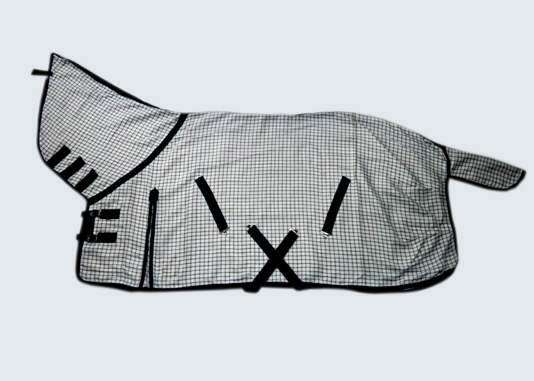 Polyester honey comb check. Double front closure buckles. Half cross-surcingles with shoulder gusset. Tail cord at back + tail flap with combo 2" velcro closures + halter loop.