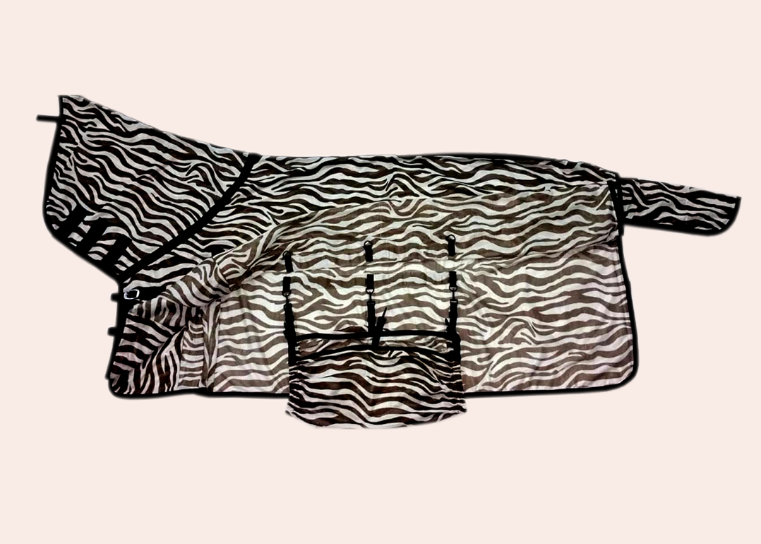 250gsm zebra mesh. Double front buckles, shoulder gusset and belly cover inside. Tail cord at back with cambo 2" velcro closure and halter loop.